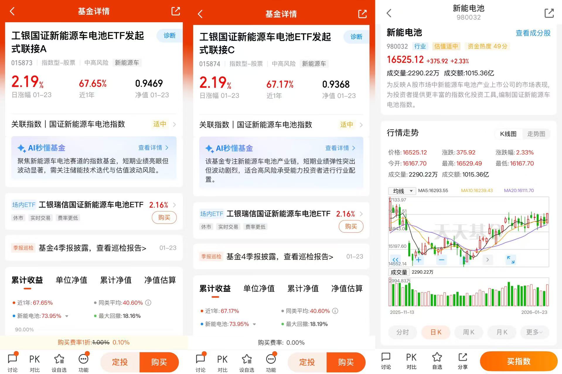 2、工银瑞信基金刘伟琳经理的工银国证新能源车电池ETF发起式联接(A:015873;C:015874),紧密跟踪国证新能源车电池指数(980032)的场外基金,2025年锂电需求超预期,头部企业订单持续火爆,供需格局改善带来产业链盈利预期提升;2026年,全球储能景气度高增,叠加国内外新能源汽车渗透率有望进一步提升、固态电池产业催化,板块高景气度有望延续。工银国证新能源车电池ETF发起式联接A(015873)“近1年”的阶段涨幅达到67.17%,远超同期沪深300指数的23.63%,在2525只同类基金中排名高居第511位。
