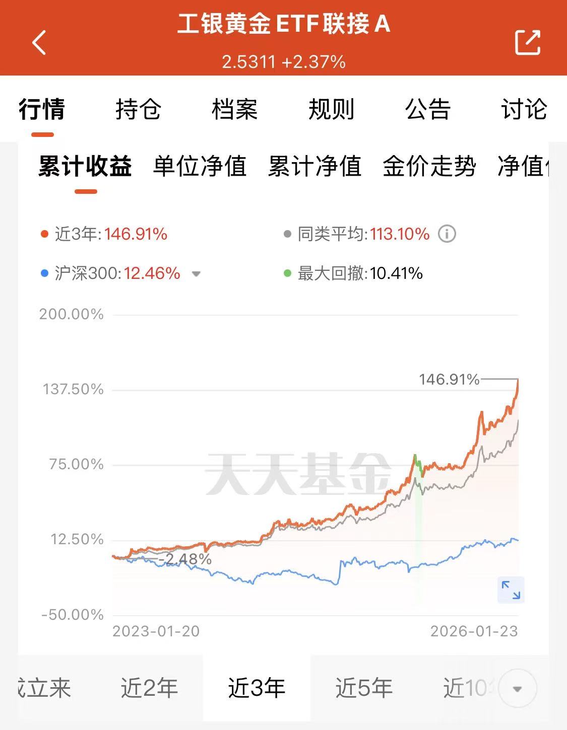 1、关于高增长潜力:正如刚才所论述的,无论是从中长期看还是从短期看,布雷顿森林体系解体后的黄金都具有长期的高增长潜力,而且工银黄金ETF联接(A:008142;C:008143;E:020341),近期的涨幅也非常惊人。工银黄金ETF联接(A:008142;C:008143;E:020341)紧密跟踪的黄金9999(AU9998)涨幅非常惊人,“近3年”阶段涨幅高达146.91%,远超同期沪深300指数的12.46%,超额收益130个百分点。