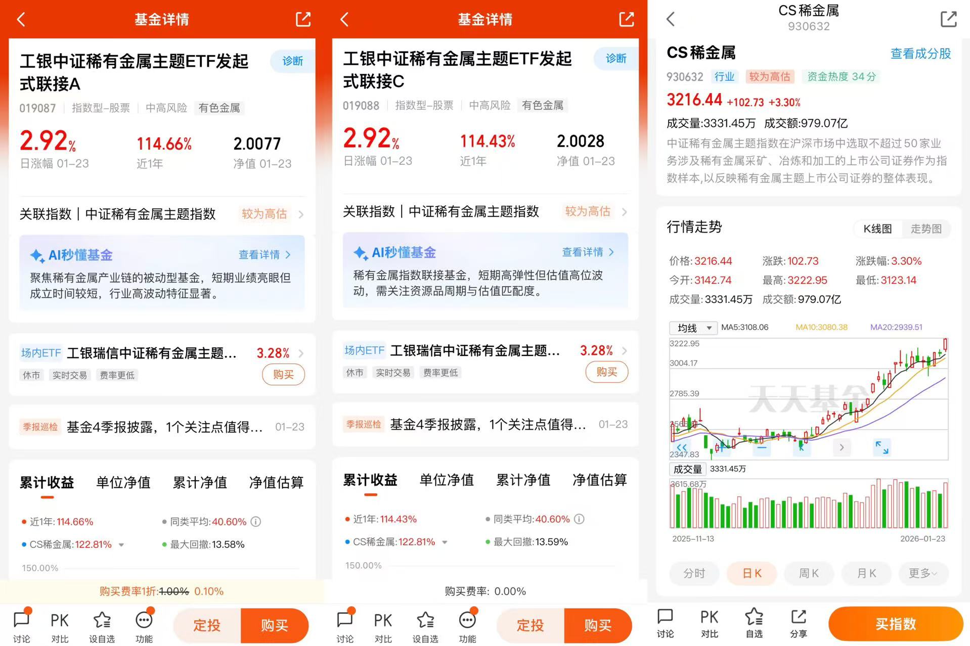 (2)持有成本全市场最低:黄金ETF联接基金的同类指跟踪黄金现货合约(AU9999)的ETF联接产品,合并份额共计7只,工银瑞信黄金ETF联接E(021499)管理费率为0.15%、托管费率为0.05%,“管理费+托管费”为同类产品最低一档。