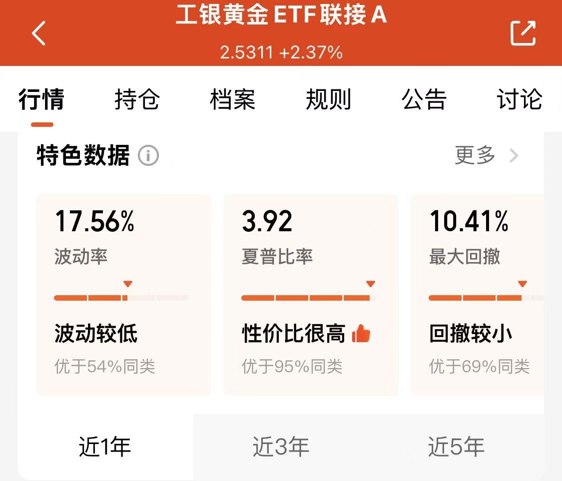 2、再来看波动性。工银黄金ETF联接(A:008142;C:008143;E:020341)的“近1年”的最大回撤只有10.29%,“回撤很低,优于69%同类”;夏普比率3.92,“性价比很高,优于95%同类”。