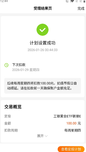 我预算过一笔账,要是按高盛预测的5400美元目标价,现在进场到年底还有13%左右的上涨空间,这还没算人民币兑美元的汇率波动可能带来的额外收益。央行购金不停、美联储降息在即、地缘风险难消,这三驾马车拉着金价往上走的动力很足。与其手里现金被通胀稀释,不如通过工银黄金ETF联接E这种低成本、高便利的方式,让资产跟着黄金这艘大船一起浮起来。2026年这班车,我决定上了,就从这周定投开始,哪怕每次只投几百块,也比干看着金价创新高强。