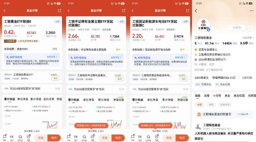 对应到具体投资工具上,工银黄金ETF联接E紧密跟踪黄金现货价格,且费率处于同类最低一档,持有7天以上免赎回费;工银中证稀有金属主题ETF联接C覆盖稀土、锂等核心稀有金属标的,贴合产业趋势;工银国证新能源车电池ETF联接C则精准跟踪新能源车电池指数,把握锂电产业链的成长机会。