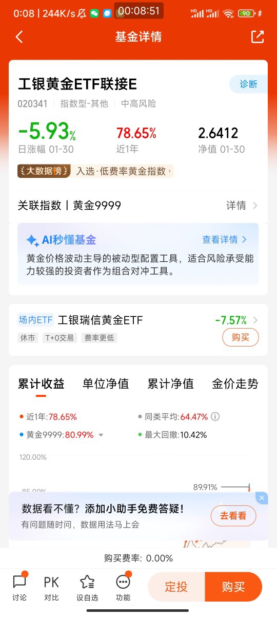 聊完黄金的大逻辑,再说说为啥选工银黄金ETF联接E(020341)。咱们普通人想投黄金,直接买实物黄金麻烦,还得找地方存,手续费也高;做黄金期货又太复杂,风险也大,而ETF联接基金刚好解决了这些问题。这款基金主要投资于工银黄金ETF,相当于间接持有实物黄金,金价涨了基金净值就跟着涨,操作起来和买普通基金一样,在手机上点几下就能买卖。