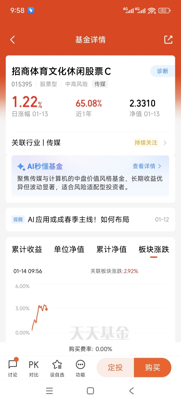 $招商体育文化休闲股票C$ 这只主动的混合基金,主要聚焦AI应用,相关传媒等方向。昨天上涨了1.22%,今天的估值又是三个点,爆发力的表现是真的强。而且持仓整体均衡。长期表现做到了涨多跌少。近一年上涨了65.08%,我看好今年能继续突破。