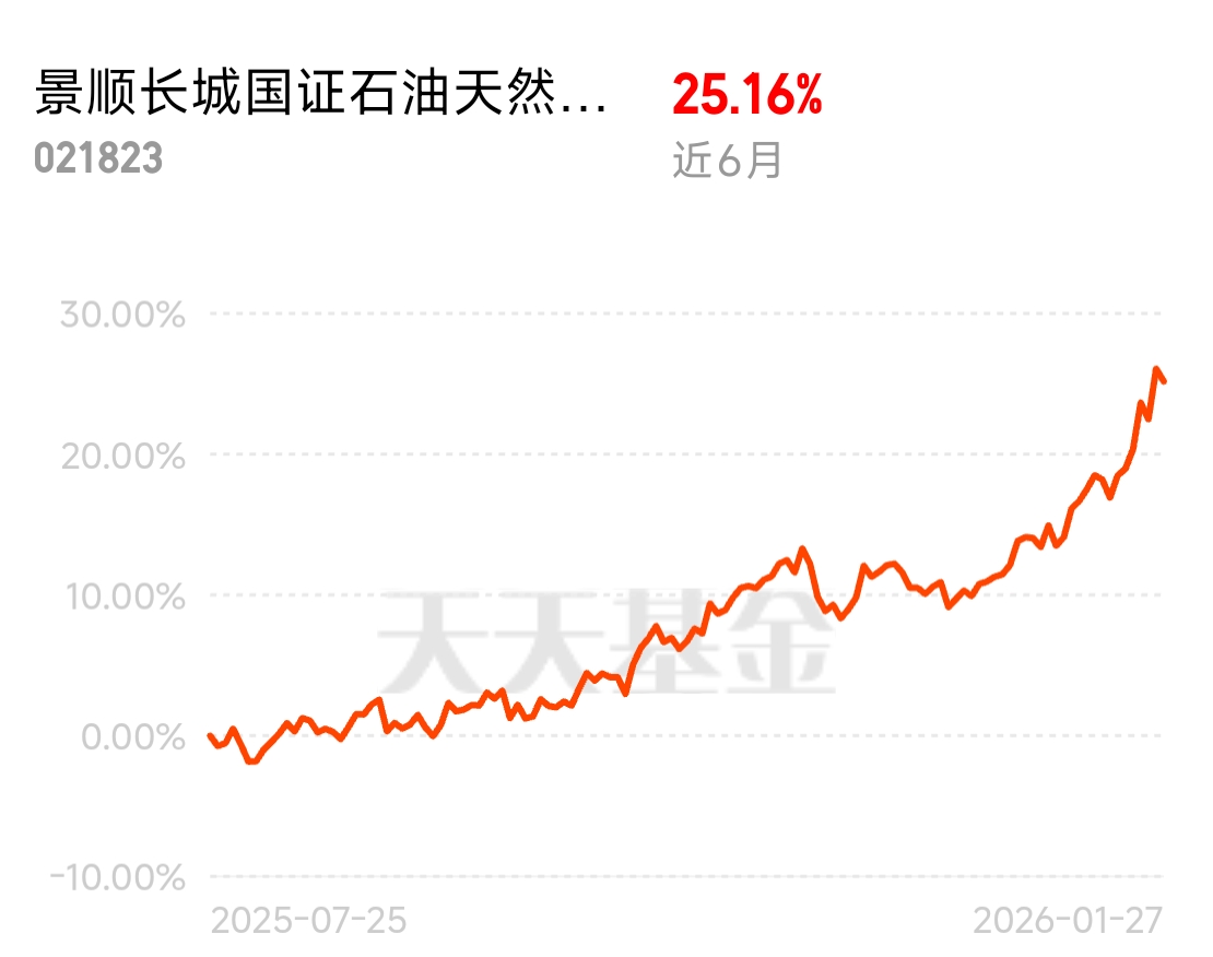 石油天然气和贵金属集体大涨,核心原因是美国寒潮导致供给减少,地缘政治持续紧张,油价淡季不淡,$景顺长城国证石油天然气ETF发起式联接基金C$ 近 6 月 25.16%,跟踪指数超精准