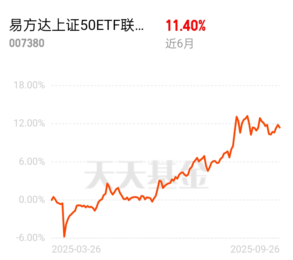 现在成长风格挺亮眼,涨得不错,可高估值的风险得防着。适当配置大盘价值,均衡持仓才安心,易方达上证50ETF联接C近6个月11.40%,持仓别后悔。