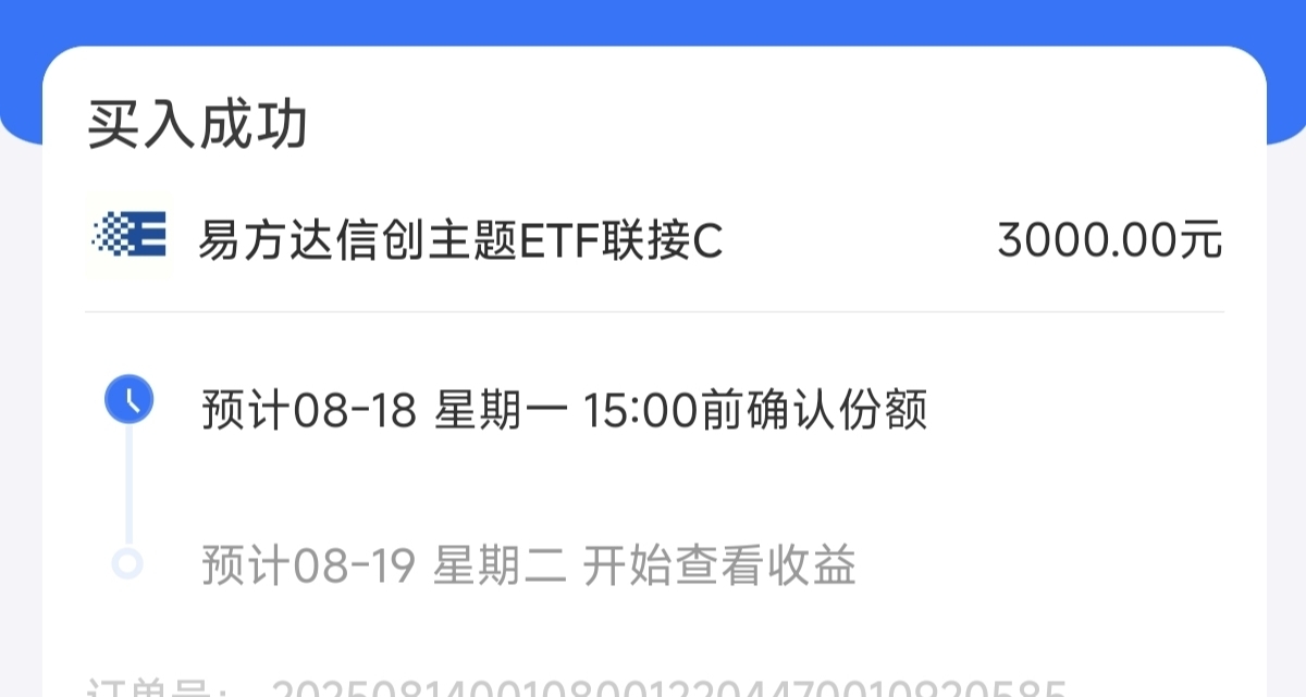 三大指数今天冲高回落,不过信创尾盘逆市上涨,看来信创行情已经来了,这种明确的主题行情还是通过指数投更加准确。今天提前布局$易方达信创ETF联接C$这只紧跟信创指数基金,估值涨幅0.44%,表现不错! 随着国常会定调推进“人工智能+”,后面我坚定看好,如果有回调的话,我会加大投入力度!!
