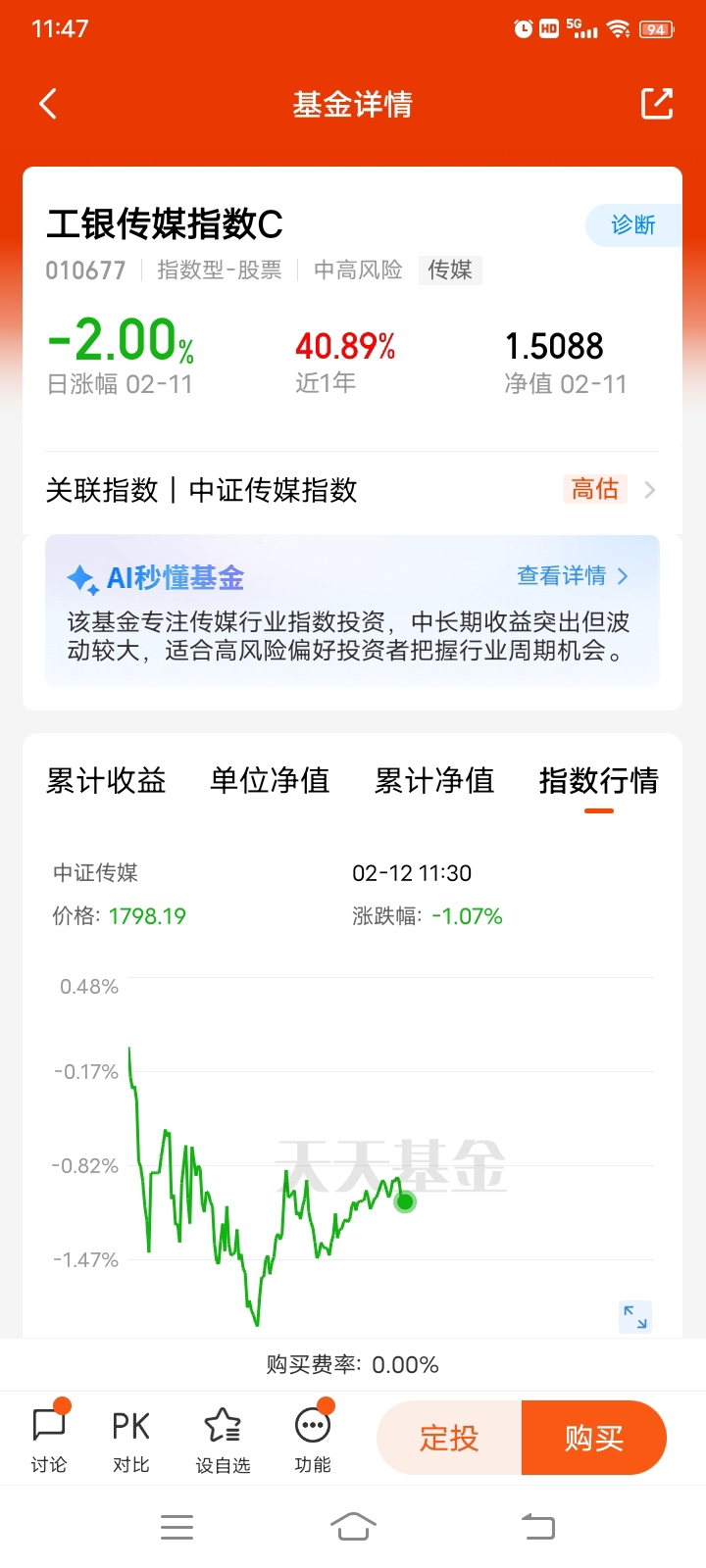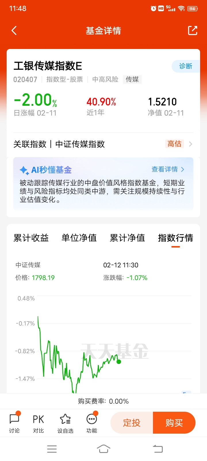 再回到工银传媒指数E本身,它跟踪的是中证传媒指数,覆盖了影视、游戏、广告营销这些核心赛道,相当于一键布局了整个传媒行业的龙头公司。从估值来看,虽然现在显示“高估”,但如果把AI赋能和行业复苏的逻辑放进去,其实成长性还是有支撑的。近一年40.90%的收益,说明在行情好的时候弹性确实够大,但也要注意,传媒板块波动本来就大,短期受政策、内容爆款的影响比较明显,不能只看过去的收益就盲目冲。