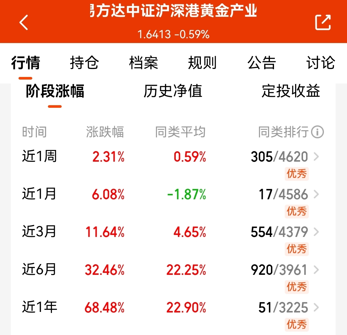 宝子们,行情越来越好了,今日又是吃肉行情,黄金也不例外,黄金股且在黄金的基础上加杠杆和久期,比黄金ETF联接有更高弹性,另外很多黄金股公司也在做其他有色金属业务,可以吃到有色大行情,易方达黄金股业绩就很给力,目前近1年收益率在所有黄金股指数产品里最高,确实是很强,这一波行情得把握住了。