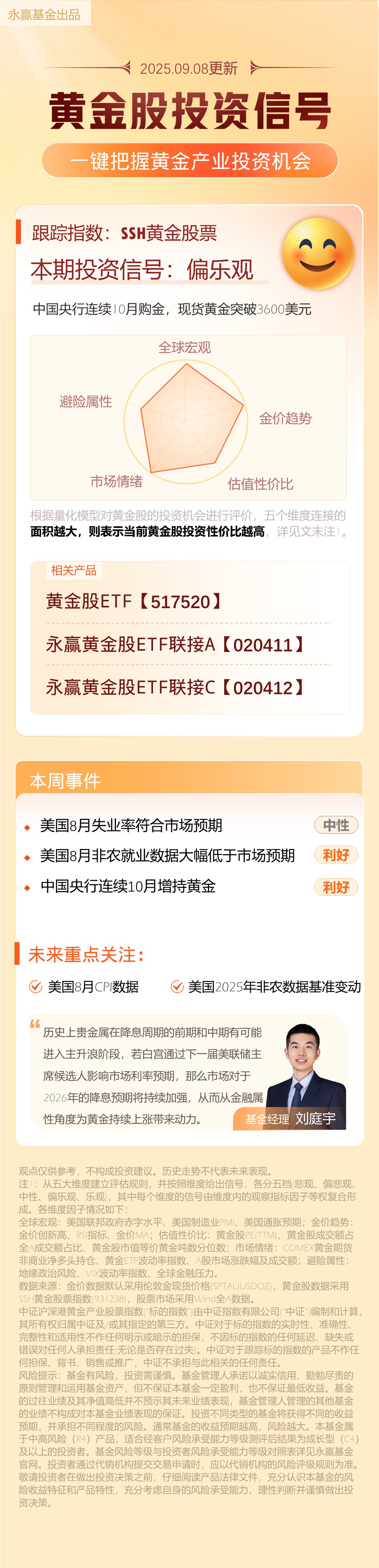 0908黄金股投资信号:偏乐观。中国央行连续10月购金,现货黄金突破3600美元