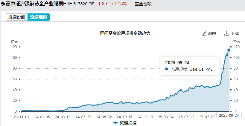 尽管金价创新高,但仍看好黄金中长期走势。场内规模最大、流动性最强的永赢中证沪港深黄金产业股票ETF及$永赢中证沪深港黄金产业股票ETF发起联接C$(A类:020411/C类:020412)昨天规模再破新高,目前已经达到了114.11亿。
