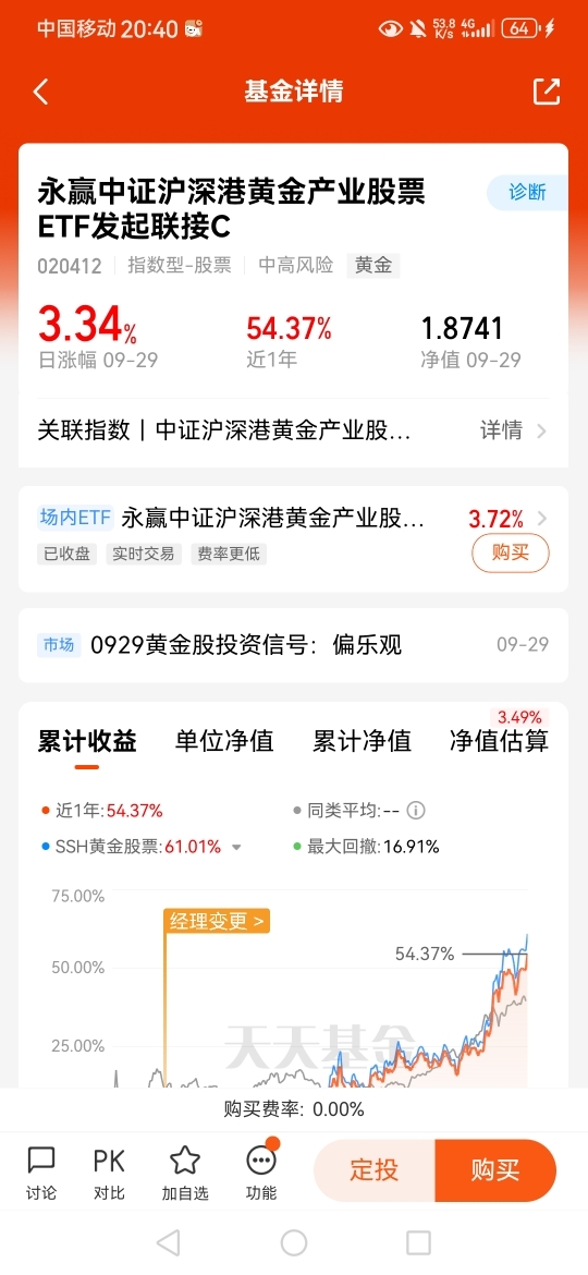 #长假来临 持基过节还是持币过节?# 黄金具有避险和保值的传统价值,在经济动荡、通货膨胀时期,黄金价格通常会逆势上涨,$永赢中证沪深港黄金产业股票ETF发起联接C$ 今日大涨+3.34%,近一年涨幅+54.37%;长期业绩优秀;随着全球经济的不确定性增加,黄金的避险和保值功能将更加凸显