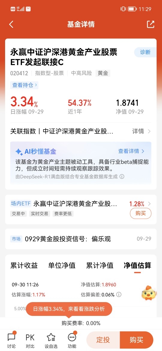 金价创历史新高,黄金避险属性凸显。$永赢中证沪深港黄金产业股票ETF发起联接C$ 昨天大涨3.34%,近三个月涨28.8%,近一年54.37%的涨幅,今天也还在涨。在牛市行情里,作为金价放大器的黄金股弹性更大,随着美联储降息,美元大概率将走弱,将进一步增加黄金需求,持基过节了。#牛市旗手回归?券商板块异动拉升#