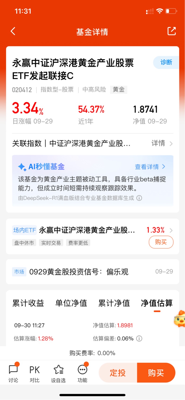 $永赢中证沪深港黄金产业股票ETF发起联接C$ 聚焦黄金产业链,是场外唯一的黄金股ETF基金,黄金股作为黄金的放大器,其弹性很强,昨天涨了3.34%,七天五涨,状态优秀啊,近一个月16.28%涨幅,近半年45.57%涨幅,业绩表现还是很优秀的,继续看涨了!#金价逼近3800美元!再创历史新高#