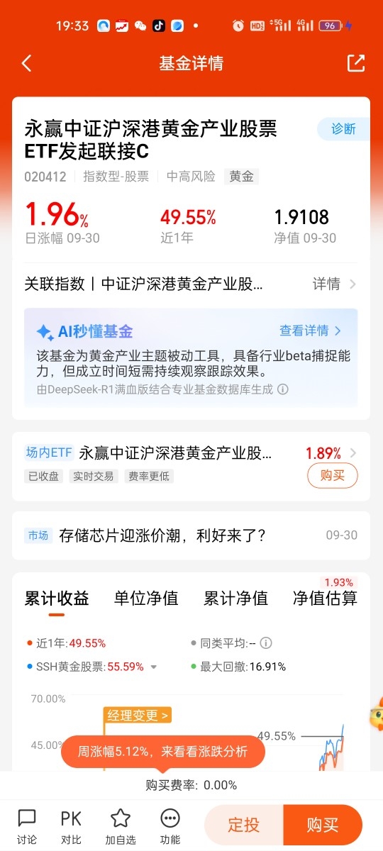 国庆节快乐,祝福祖国永远繁荣昌盛,黄金连涨2天,永赢黄金股ETF020412今天净值大涨1.96%,近三个月涨幅30.75%,永赢黄金股是市场规模大流动性好的黄金基,弹性高,非常看好黄金行情,外围还有诸多利好,上车啦。