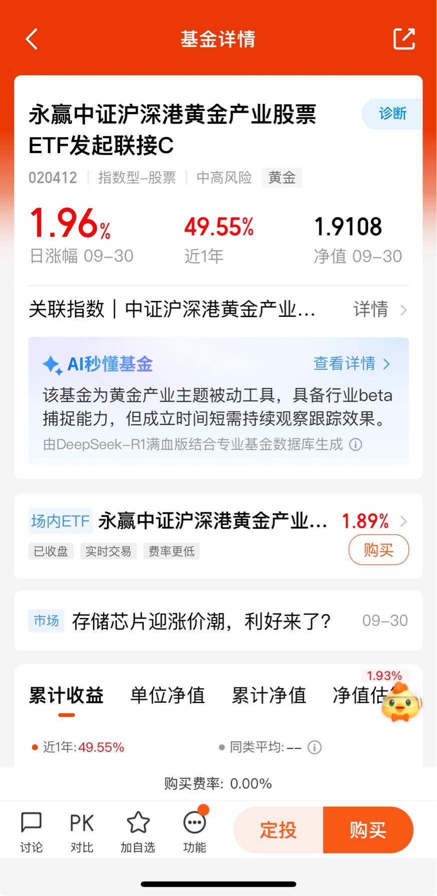 $永赢中证沪深港黄金产业股票ETF发起联接C$今天收1.96%可以哈,近一个月收