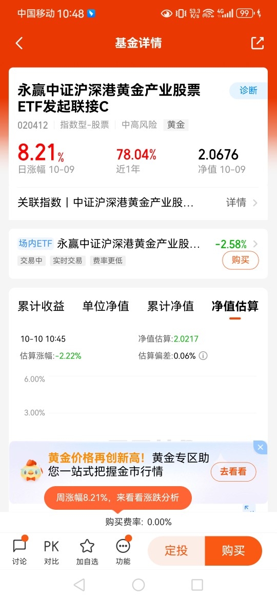 $永赢中证沪深港黄金产业股票ETF发起联接C$ 昨日更是大涨+8.21%,近一年涨幅78.04%,各个阶段业绩走势亮眼,中长期布局更值得期待,黄金股本身还处于低位,持续性强,相关黄金,黄金股进一步放大投资收益特征明显!黄金股素有"金价放大器"之称,未来可期呀#10月基金投资策略#