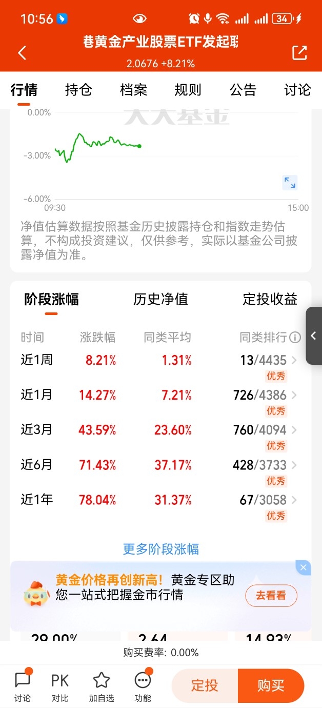 $永赢中证沪深港黄金产业股票ETF发起联接C$昨天大涨+8.21%,已经连续三天上涨,涨起来真是毫不含糊,趁着今天调整,正好跟上了。近一个月涨幅+14.27%,近三个月涨幅+43.59%,近一年涨幅+78.04%,不愧是目前场内规模最大、且流动性最好的一只黄金指数,继续看好后市表现。#10月基金投资策略#