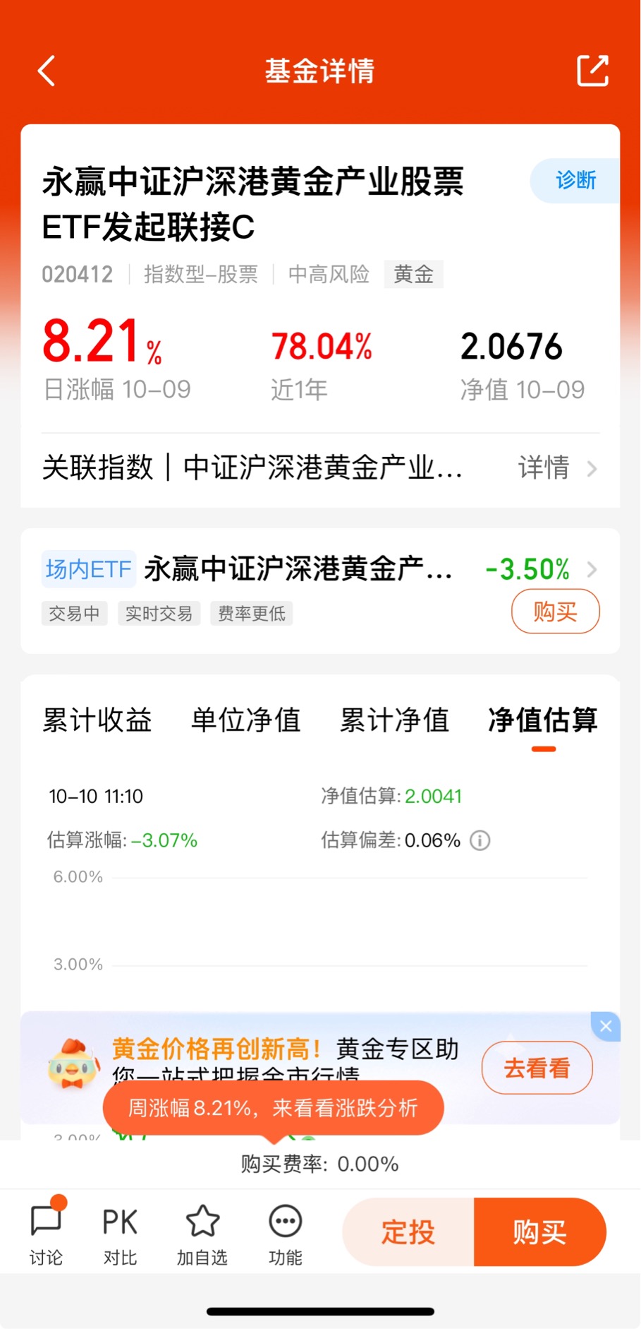 $永赢中证沪深港黄金产业股票ETF发起联接C$昨天大涨8.21%,近一个月收14