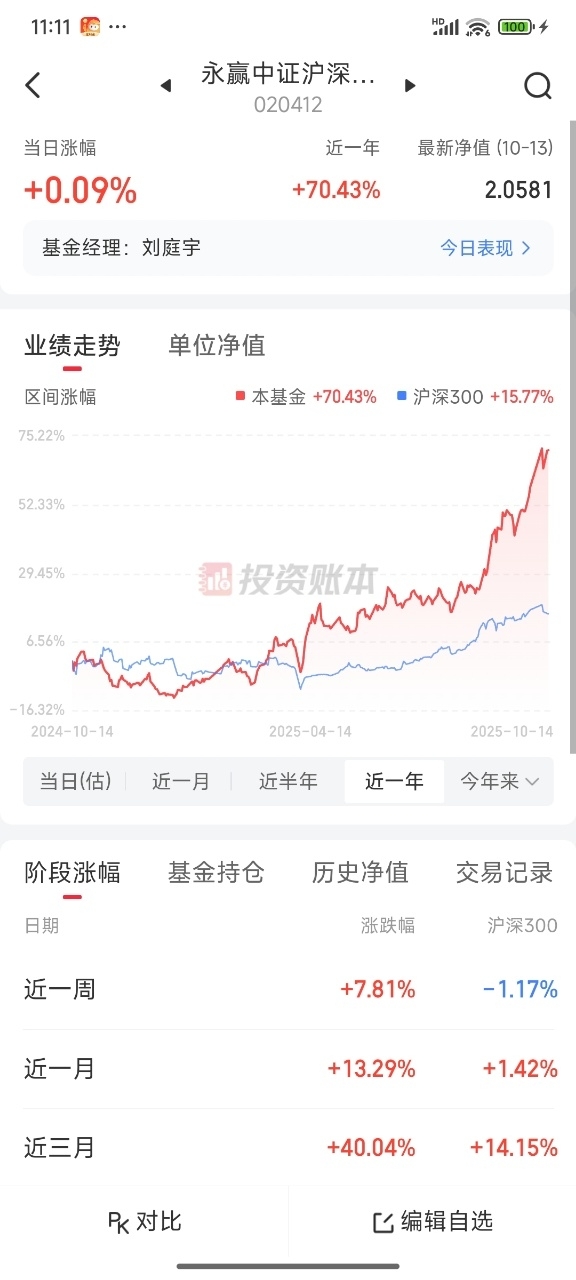 A股今天震荡上涨,三大指数涨了不少,黄金近期表现还不错,永赢黄金股ETF020412今天估值又涨0.09%%,近一个月收益率13.18%,近六个月涨幅57.99%,在同类基金中排名优秀,看好这个方向,我今天先建个仓,之后再继续分批加仓了。
