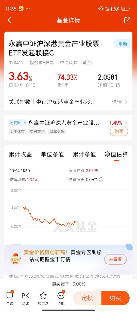 昨晚逆势暴涨3.63%的$永赢中证沪深港黄金产业股票ETF发起联接C$五天四涨,