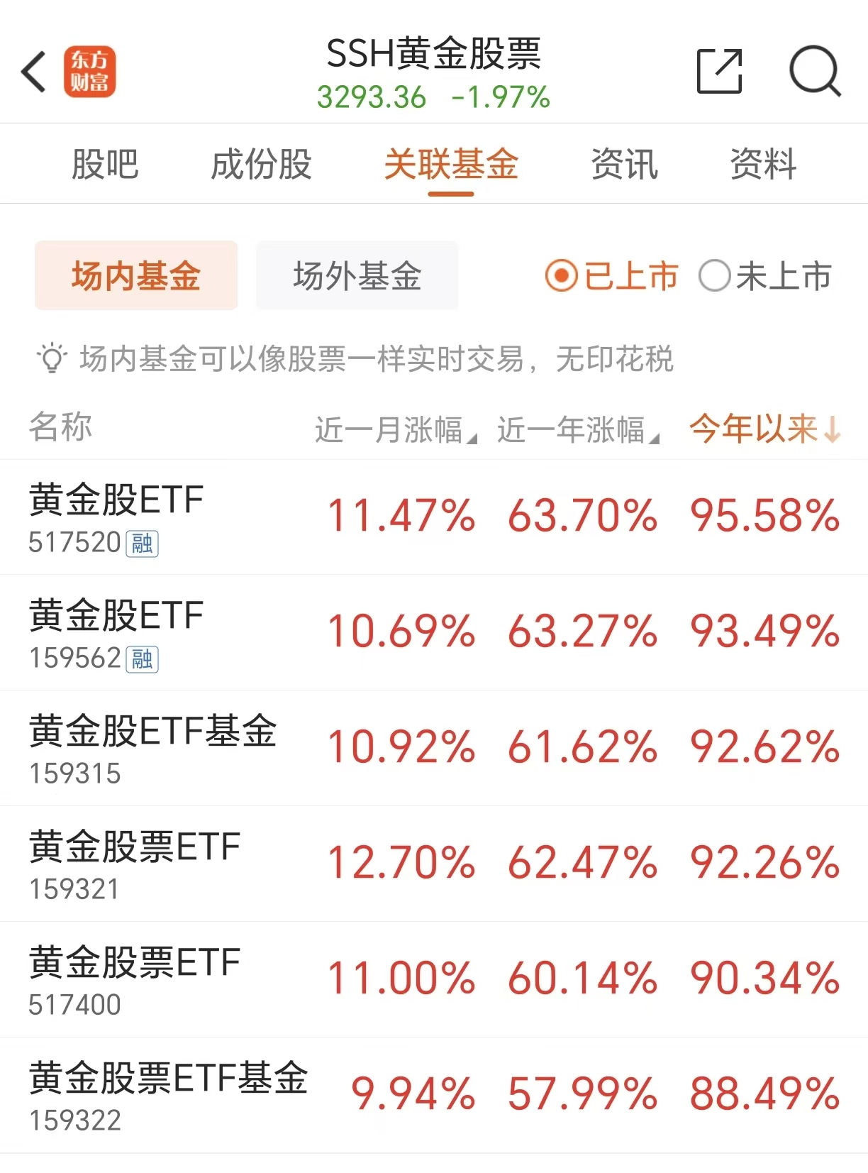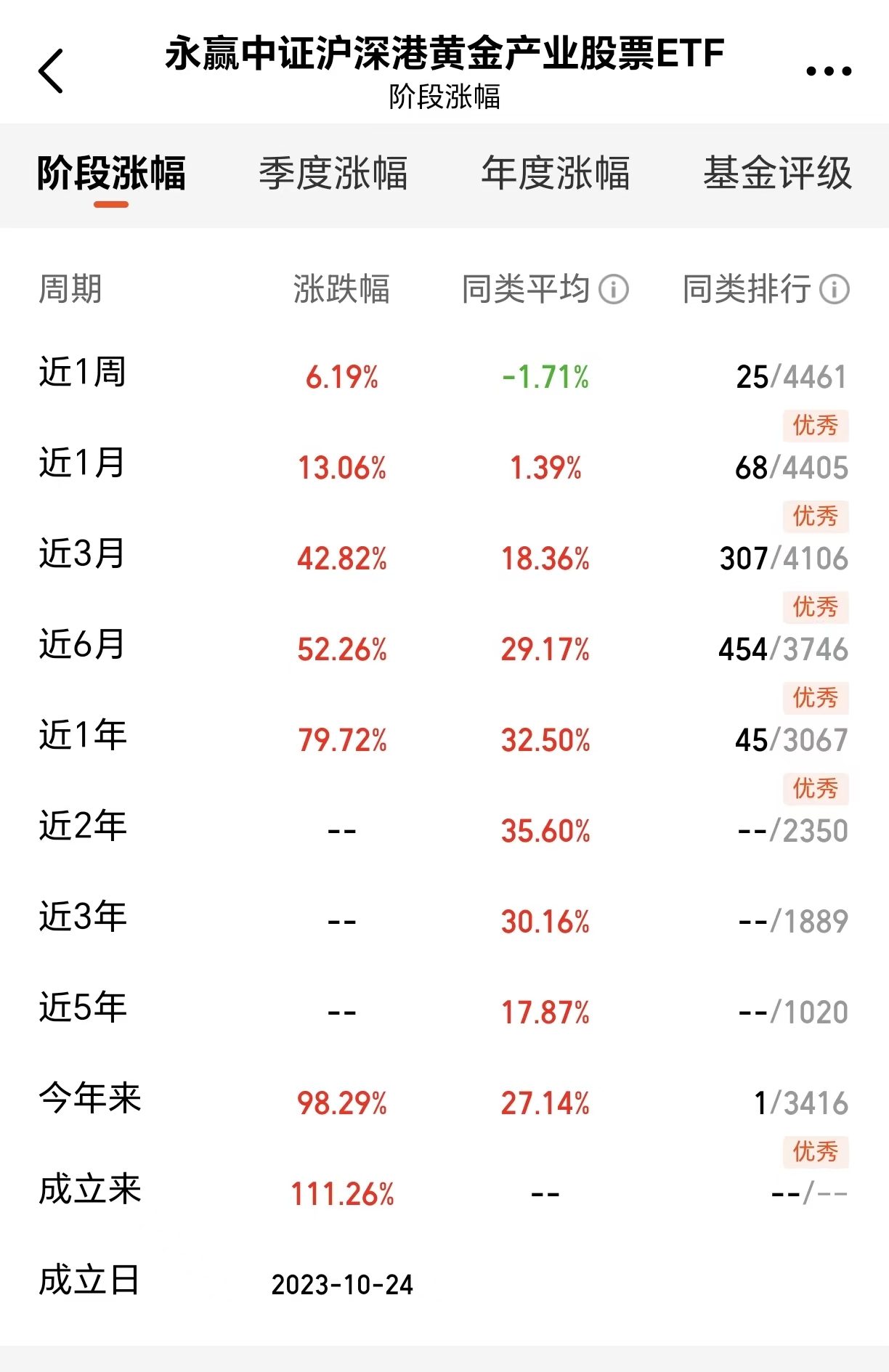 亮眼的业绩数据更印证其投资价值:近1周上涨6.19%,近1月上涨13.06%,近三月上涨42.82%,近6月上涨52.26%,近1年上涨79.72%,今年来涨幅高达98.29%,稳居同类第一梯队!基金成立以来更是斩获111.26%的累计收益,成功实现收益翻倍,用实力彰显黄金产业投资潜力。