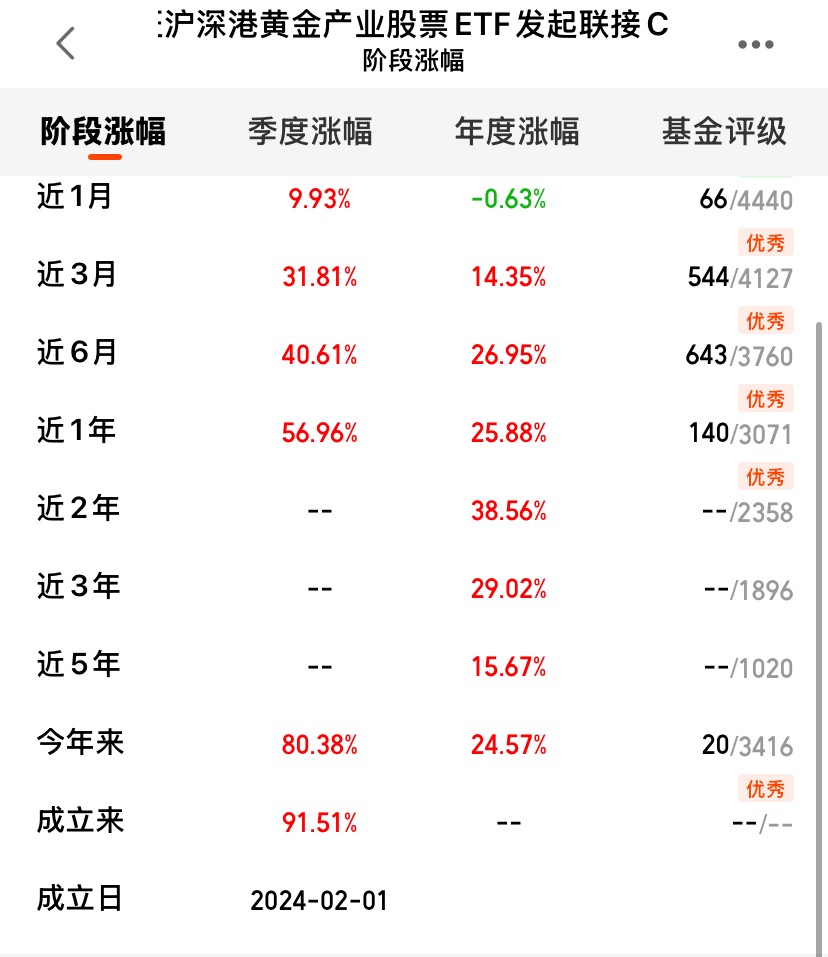 #黄金暴力反弹 一举突破新高# 黄金板块近期行情强劲,国际金价屡创新高,国内黄金相关产品价格也同步上涨,黄金ETF规模大幅扩张,资金持续流入。$永赢中证沪深港黄金产业股票ETF发起联接C$ 近一个月收益9.93%;近三个月收益31.81%,近一年收益56.96%,长期业绩优秀;黄金作为核心资产配置的重要性和韧性持续凸显,适合长期持有以对冲通胀和货币风险。