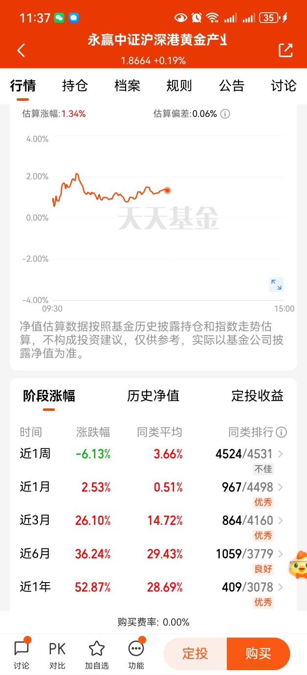 黄金回暖趋势明显,$永赢中证沪深港黄金产业股票ETF发起联接C$ 目前估值一个多点。跟踪是黄金股ETF指数,是目前场内规模最大、且流动性最好的一只黄金指数。我们来看看业绩,近三个月涨幅+26.10%,近一年涨幅+52.87%,整体还不错。相比现货黄金在历史高位,黄金股无疑是金价的放大器。#科技热点摊开业啦#