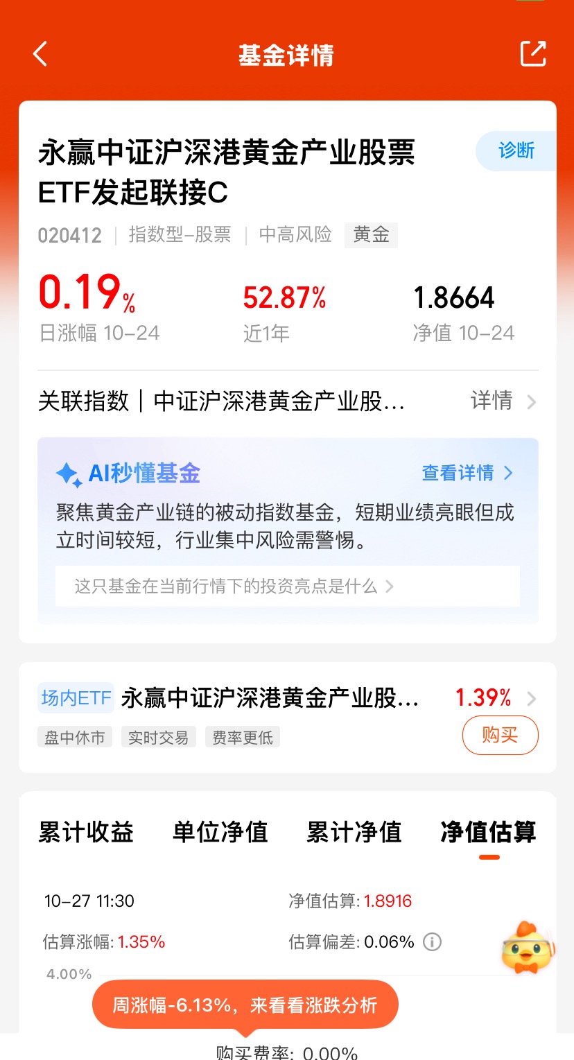 #黄金创12年来最大单日跌幅!什么信号# 黄金股近半年涨幅显著,且主力资金净流入居前,机构投资者加速布局,黄金ETF规模年内翻番,显示市场对黄金板块的长期看好。$永赢中证沪深港黄金产业股票ETF发起联接C$ 上一个交易日上涨0.19%,近三个月收益26.10%;近六个月收益36.24%,近一年收益52.87%,长期业绩不错;黄金作为避险资产,其长期投资价值依然显著。历史数据显示,降息周期中黄金的避险属性和抗通胀功能将进一步凸显。