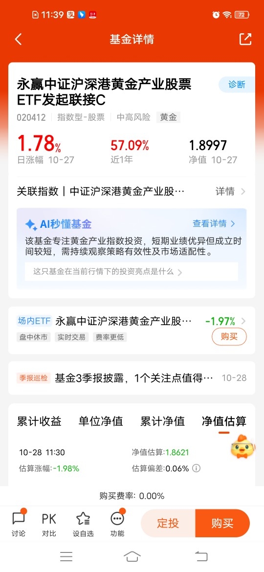 $永赢中证沪深港黄金产业股票ETF发起联接C$ 其中7天无手续费交易,非常适合波段。昨天涨幅1.78%,近三个月涨幅29.62%,近六个月涨幅40.56%,近一年涨幅57.09%,黄金股作为传统的避险资产,其吸引力自然得到了提升,寻求资产保值增值的机会,主要投资的是黄金产业的上市公司,指数弹性大于金价。并且指数的费率低。更值得期待。#10月看好哪些投资赛道?等你来分享#