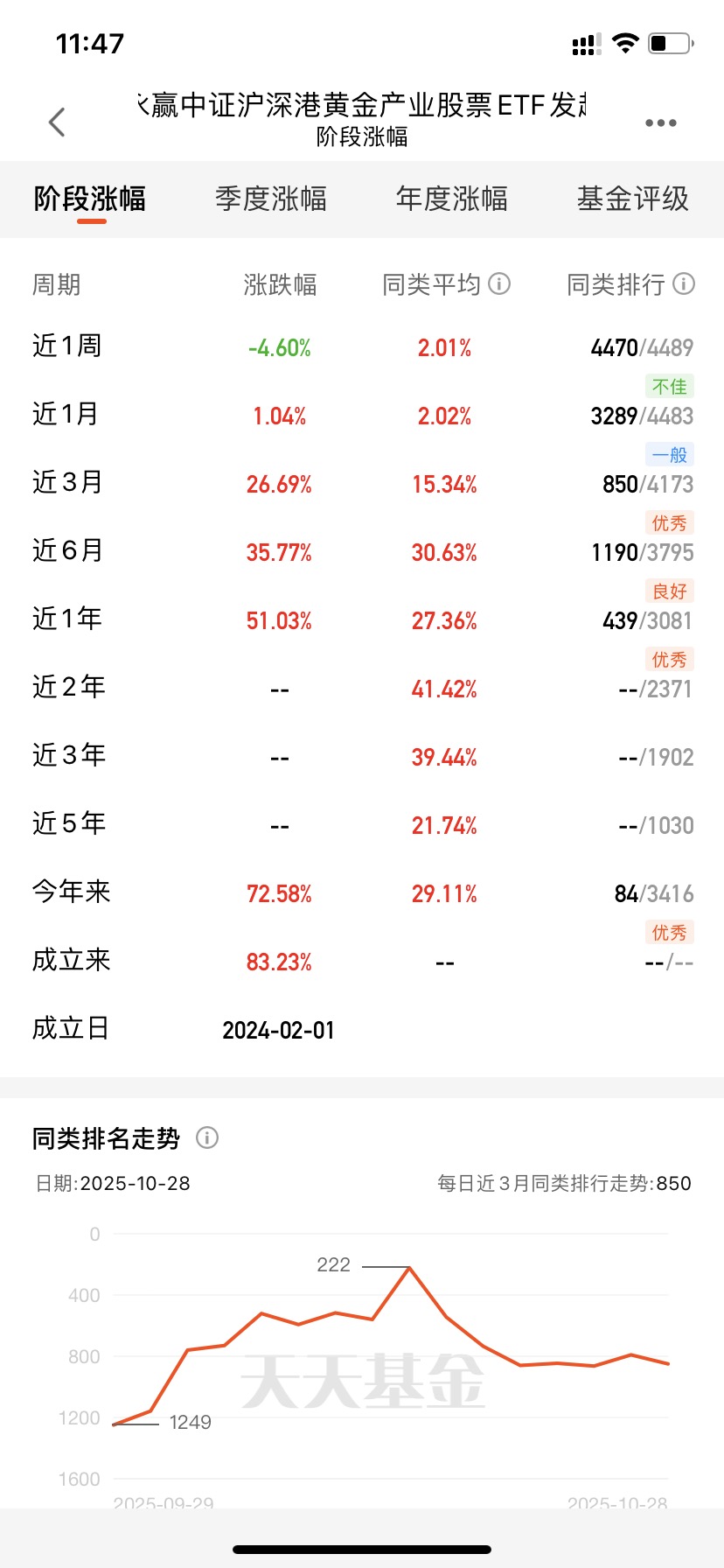 $永赢中证沪深港黄金产业股票ETF发起联接C$ 近三个月26.69%涨幅,近半年35.77%涨幅,近一年51.03%涨幅,业绩表现稳健向上,还不错呀!永赢黄金股是场外唯一的黄金股ETF联接基金,黄金股ETF除了具备黄金的避险属性外,还具有股性,因此弹性比黄金还要强,还是很值得期待了!#黄金价格“高台跳水”:深蹲还是转向?#