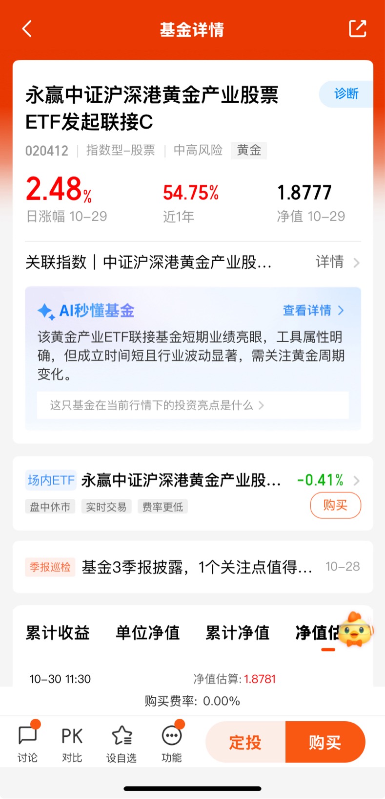#黄金价格“高台跳水”:深蹲还是转向?# 在全球经济不确定性上升的背景下,黄金作为传统避险资产的吸引力凸显。央行持续购金行为强化了其作为“最后货币”的地位。全球央行持续购金的趋势未变,为金价提供底部支撑。$永赢中证沪深港黄金产业股票ETF发起联接C$ 昨天上涨2.48%,近三个月收益30.06%;近六个月收益38.88%,近一年收益54.75%,长期业绩不错;在货币超发、通胀预期上升的环境中,黄金能有效对冲货币贬值风险,长期保值功能显著。