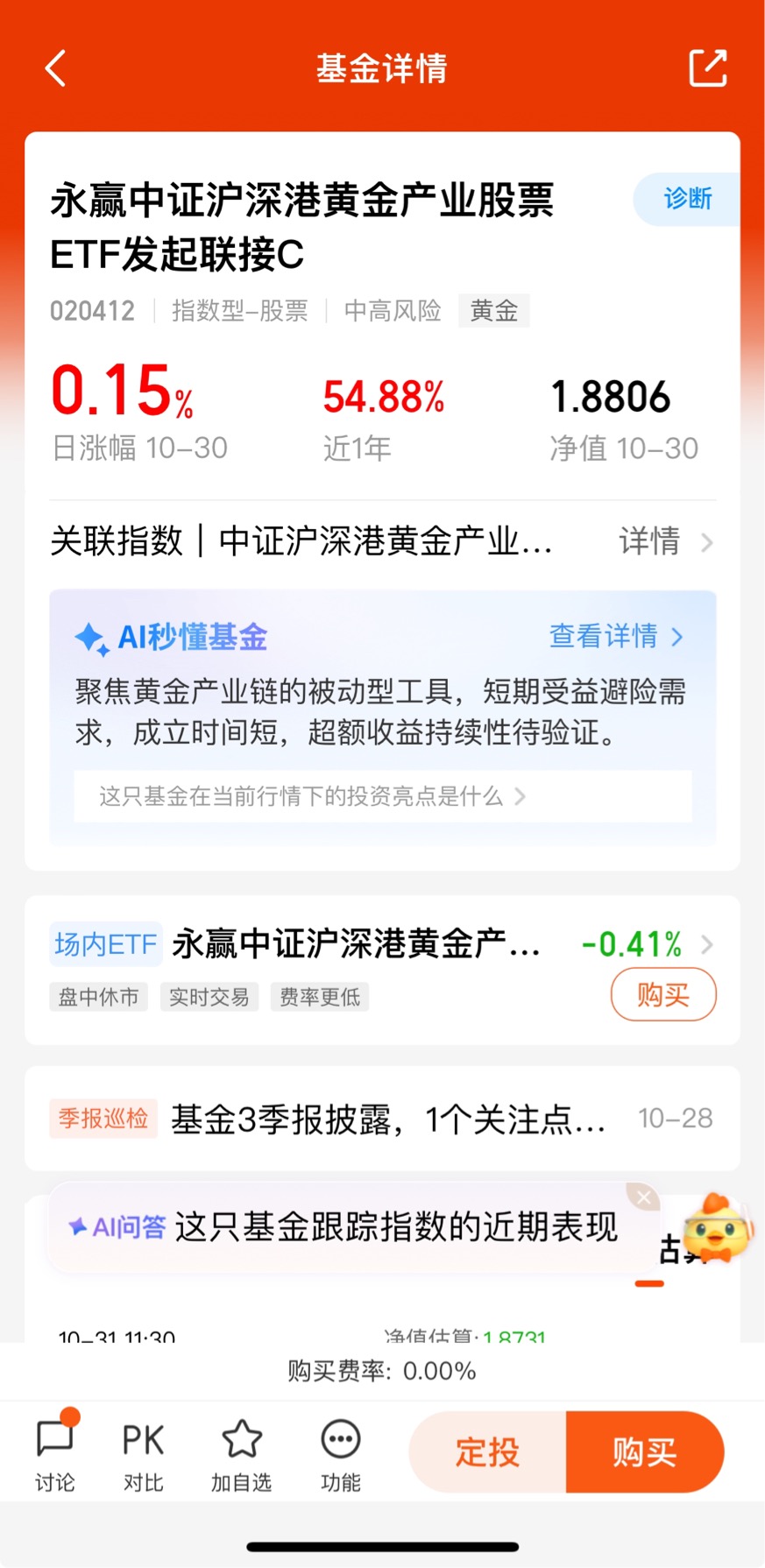 $永赢中证沪深港黄金产业股票ETF发起联接C$昨天收0.15%,近3个月收29.
