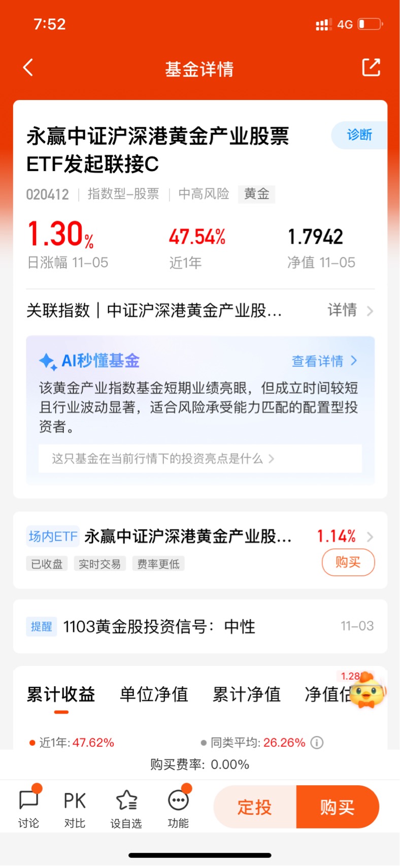 $永赢中证沪深港黄金产业股票ETF发起联接C$ 今天涨了1.30%,近半年涨超32%,业绩表现还是不错的!近期虽有震荡,但是黄金的避险属于强,黄金股作为黄金的放大器,涨势回来,弹性自然也是比黄金强! 永赢黄金股产业是场外唯一的黄金股ETF联接基金,目前黄金股投资性价比凸显,值得继续关注了!#11月基金投资策略#
