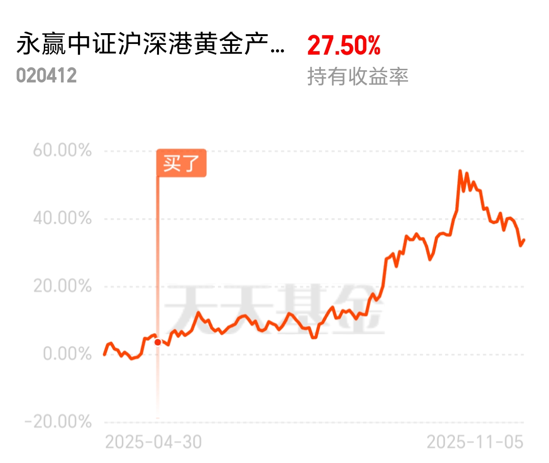 $永赢中证沪深港黄金产业股票ETF发起联接C$ 紧密跟踪黄金产业指数,覆盖沪深港三地黄金采掘、冶炼等全产业链企业,今天上涨1.30%,看历史业绩, 近3个月收涨22.34%,近一年收涨47.54%,感觉黄金赛道行情又有起飞迹象了,重点关注了。$永赢中证沪深港黄金产业股票ETF发起联接C$