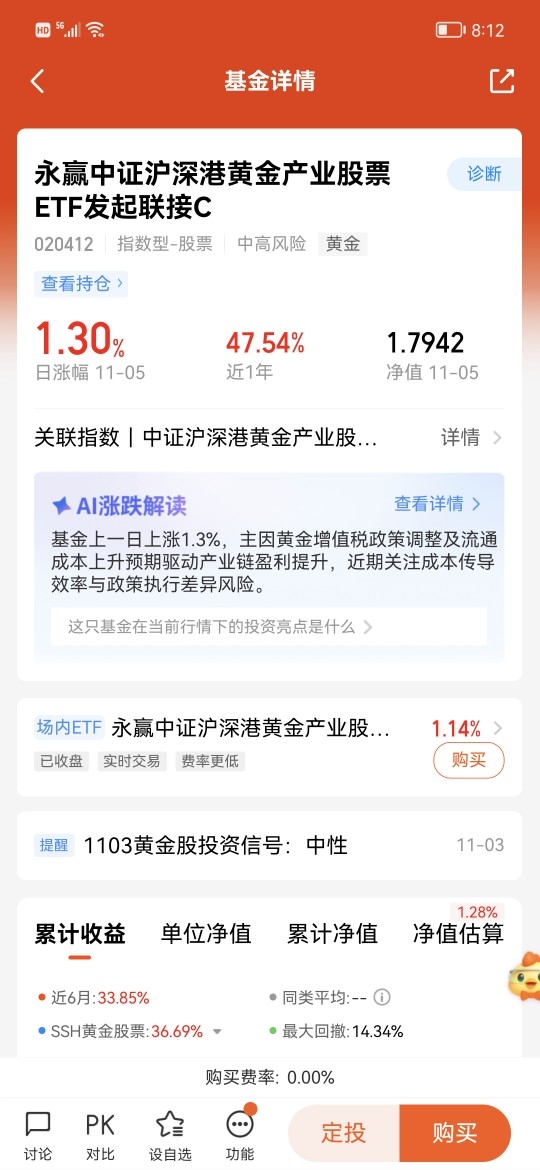 作为金价放大器的$永赢中证沪深港黄金产业股票ETF发起联接C$今天上涨1.3%,