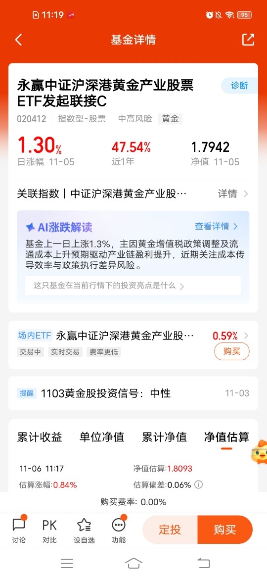 $永赢中证沪深港黄金产业股票ETF发起联接C$黄金股反弹能力不错,昨天涨幅1.3