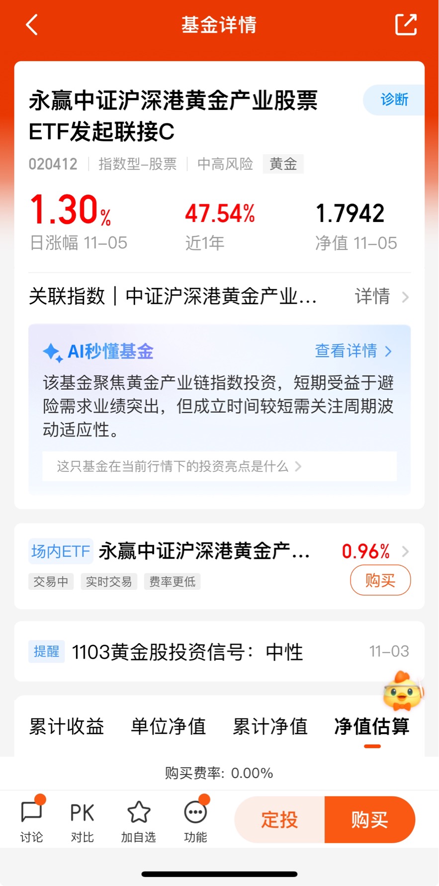 $永赢中证沪深港黄金产业股票ETF发起联接C$昨天收1.30%,近3个月收22.