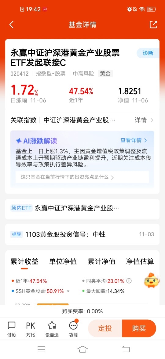 $永赢中证沪深港黄金产业股票ETF发起联接C$黄金股反弹能力不错,今晚更新涨幅1