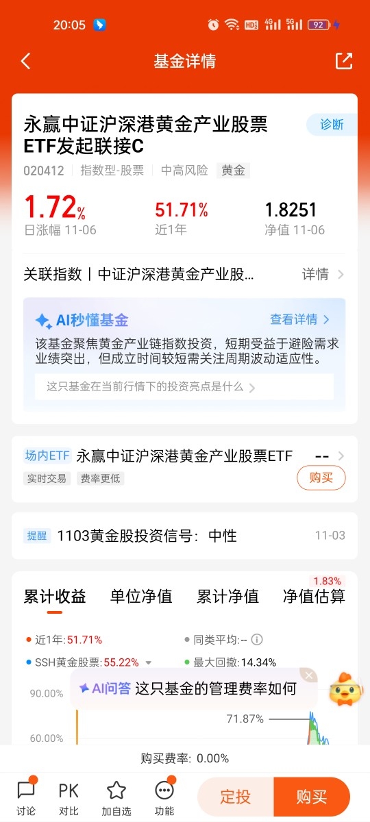 今天上证指数非常给力,又站4000点了,今年以来黄金也是一路狂飙,永赢黄金股ETF020412今天净值大涨1.72%,近三个月收益率22.42%,近一年收益率51.71%,黄金还在上涨通道,长期确定性强,值得入。