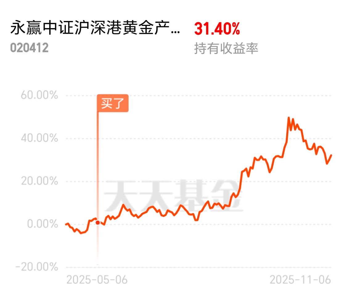 $永赢中证沪深港黄金产业股票ETF发起联接C$ 紧密跟踪黄金产业指数,覆盖沪深港三地黄金采掘、冶炼等全产业链企业,昨天上涨1.72%连涨二天,不出意外,今天能继续上涨,看历史业绩, 近3个月收涨22.42%,近一年收涨51.71%,目前,感$永赢中证沪深港黄金产业股票ETF发起联接C$