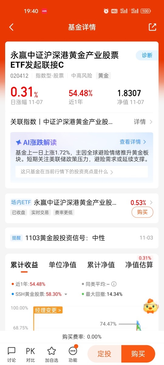 今天黄金板块非常给力,逆市上涨,今年以来黄金也是一路狂飙,自选里的永赢黄金股ETF020412今天净值又涨0.31%,近三个月收益率22.42%,近一年收益率51.71%,黄金还在上涨通道,长期确定性强,值得入。