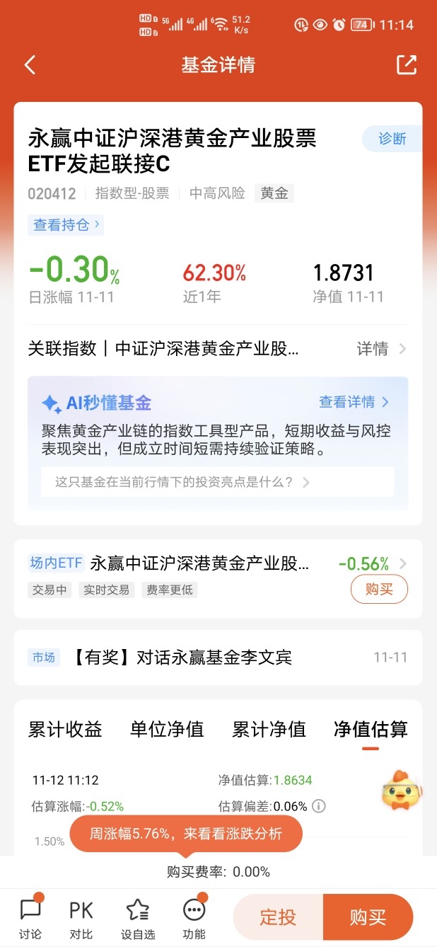 调整的时候性价比还是不错的,$永赢中证沪深港黄金产业股票ETF发起联接C$现在入