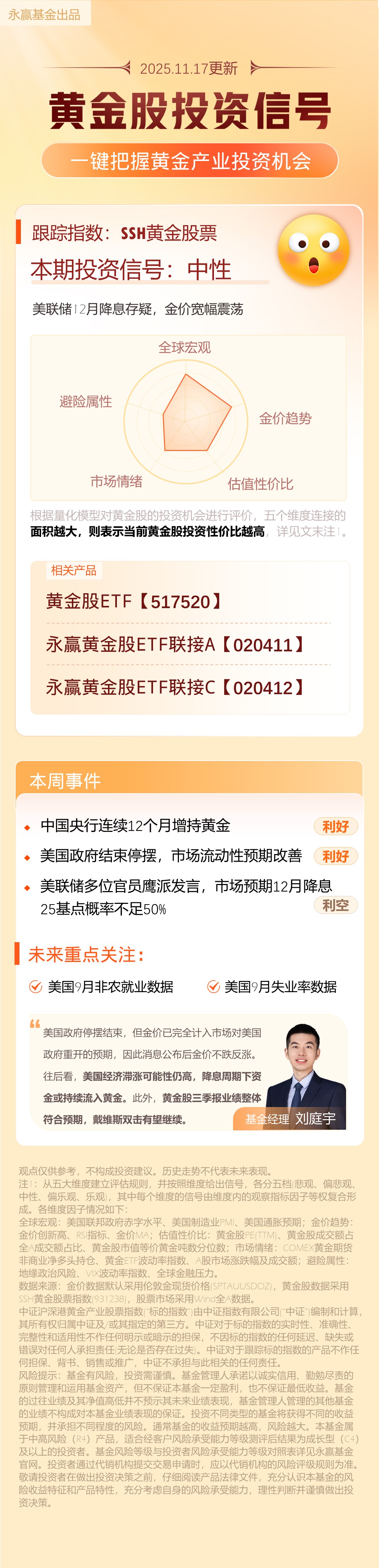 1117黄金股投资信号:中性。美联储12月降息存疑,金价宽幅震荡。