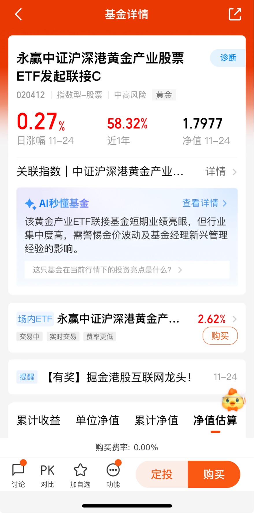 $永赢中证沪深港黄金产业股票ETF发起联接C$昨天收0.27%,近3个月收19.