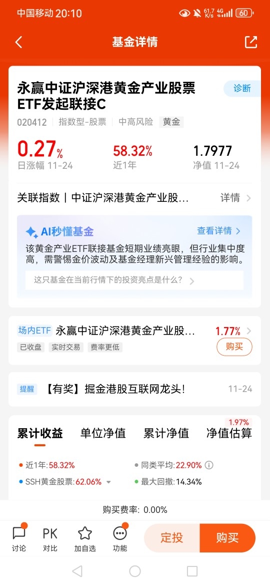 $永赢中证沪深港黄金产业股票ETF发起联接C$反弹力度不错,今日小幅上涨+0.2