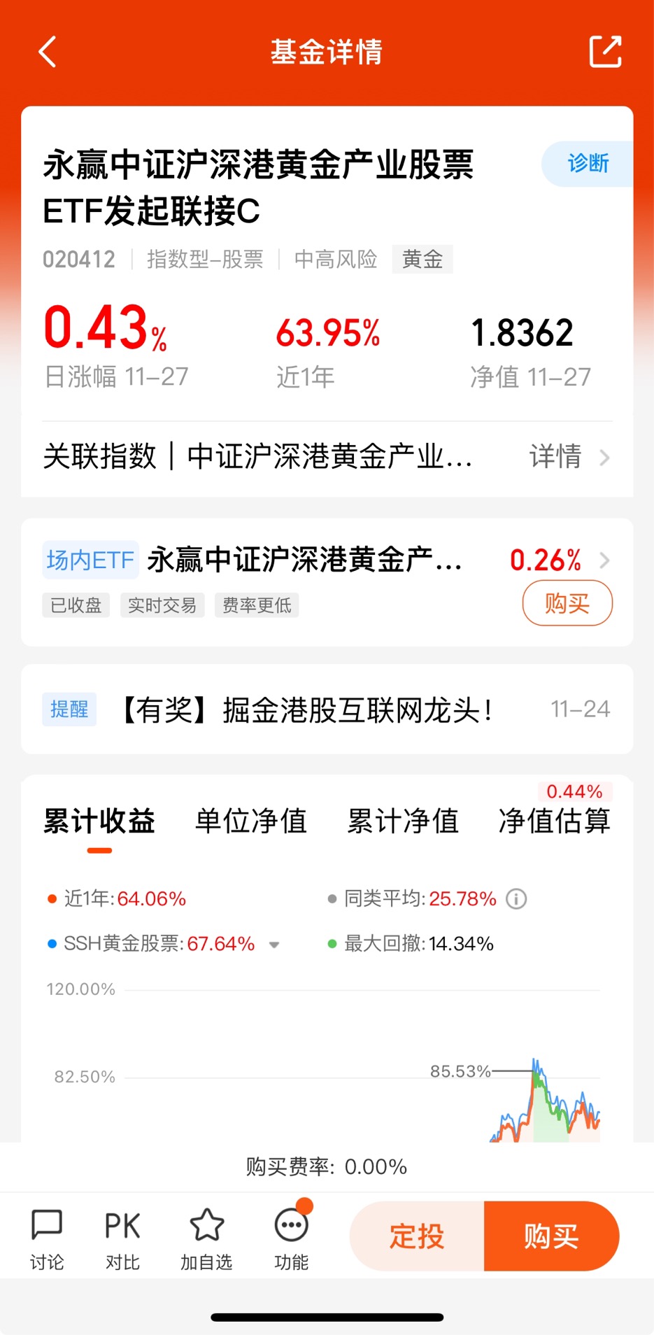 $永赢中证沪深港黄金产业股票ETF发起联接C$ 今天收0.43%,近3个月收18.02%,近6个月收32.25%,近一年收63.95%,表现优秀!它是聚焦黄金产业链的指数化工具,是唯一的场外黄金股ETF指数,基金覆盖沪港深三地黄金采掘、冶炼、零售全链条龙头企业,成为捕捉黄金行情的利器。