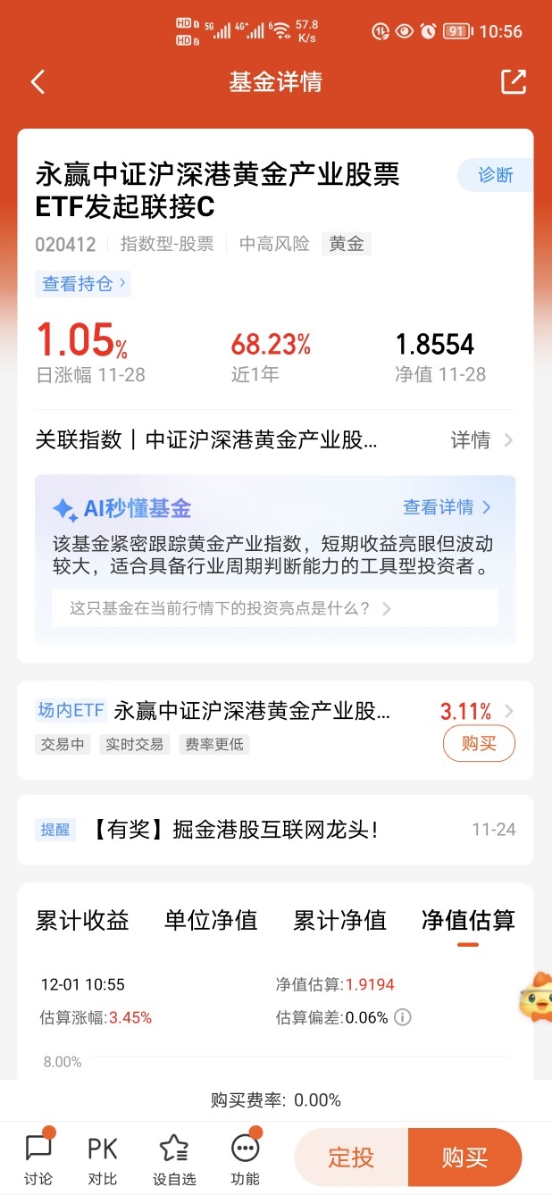 展望后市,我认为黄金及黄金股的上行空间值得重视。$永赢中证沪深港黄金产业股票ETF发起联接C$ 黄金股把握金价和股市双重驱动,又是黄金的放大器,弹性强的很了!今天也是迎来了开门红啊,目前的估值已经涨超三个点了,表现还是相当强劲的,业绩方面也是很抗打,多阶段排名都是非常优秀。最近一年的涨幅超过68个点,现在地缘环境不稳,用黄金股来均衡配置也是很有必要的#11月我的投资总结!#