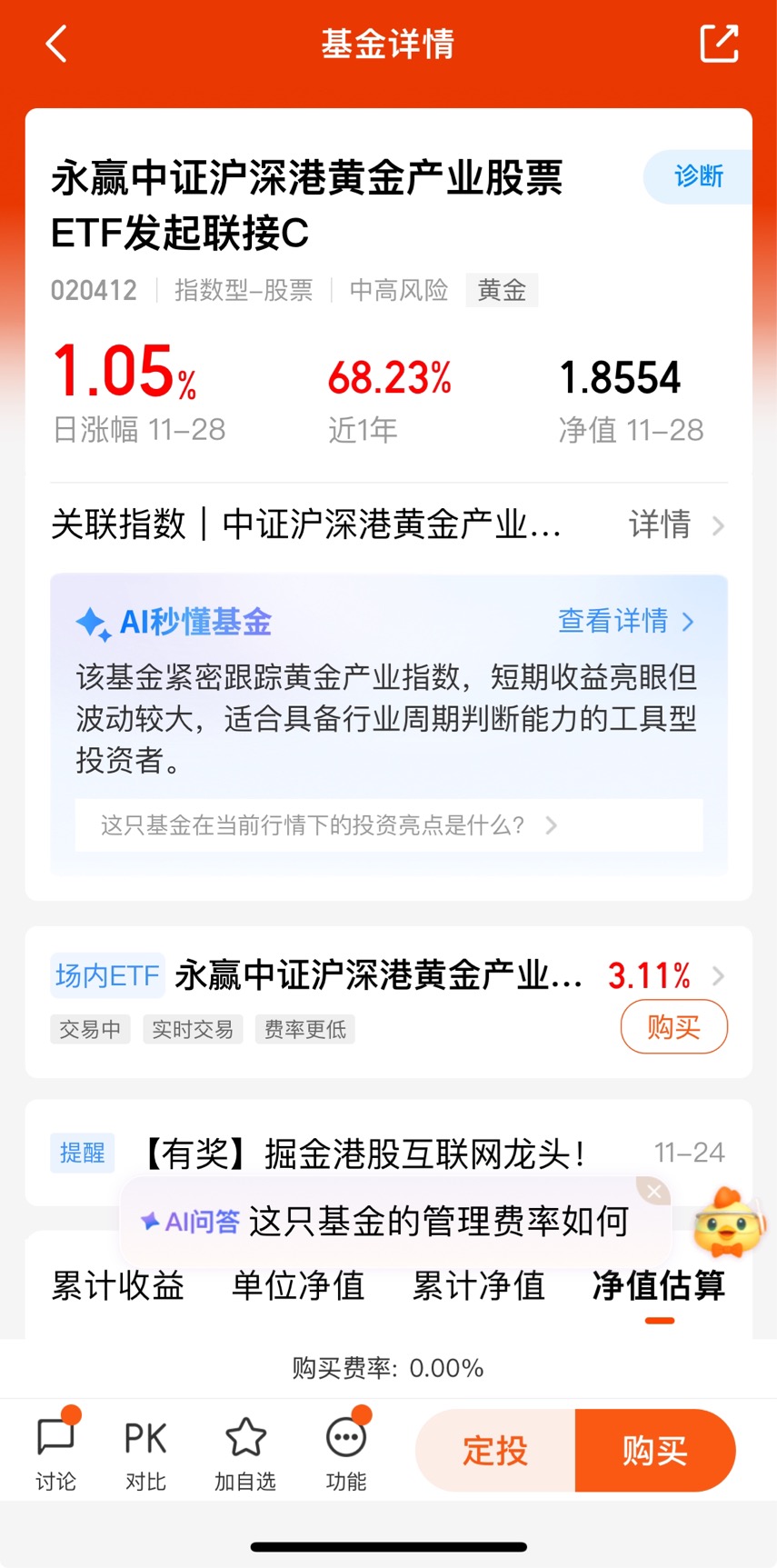 $永赢中证沪深港黄金产业股票ETF发起联接C$行情回来了周五收1.05%,近3个