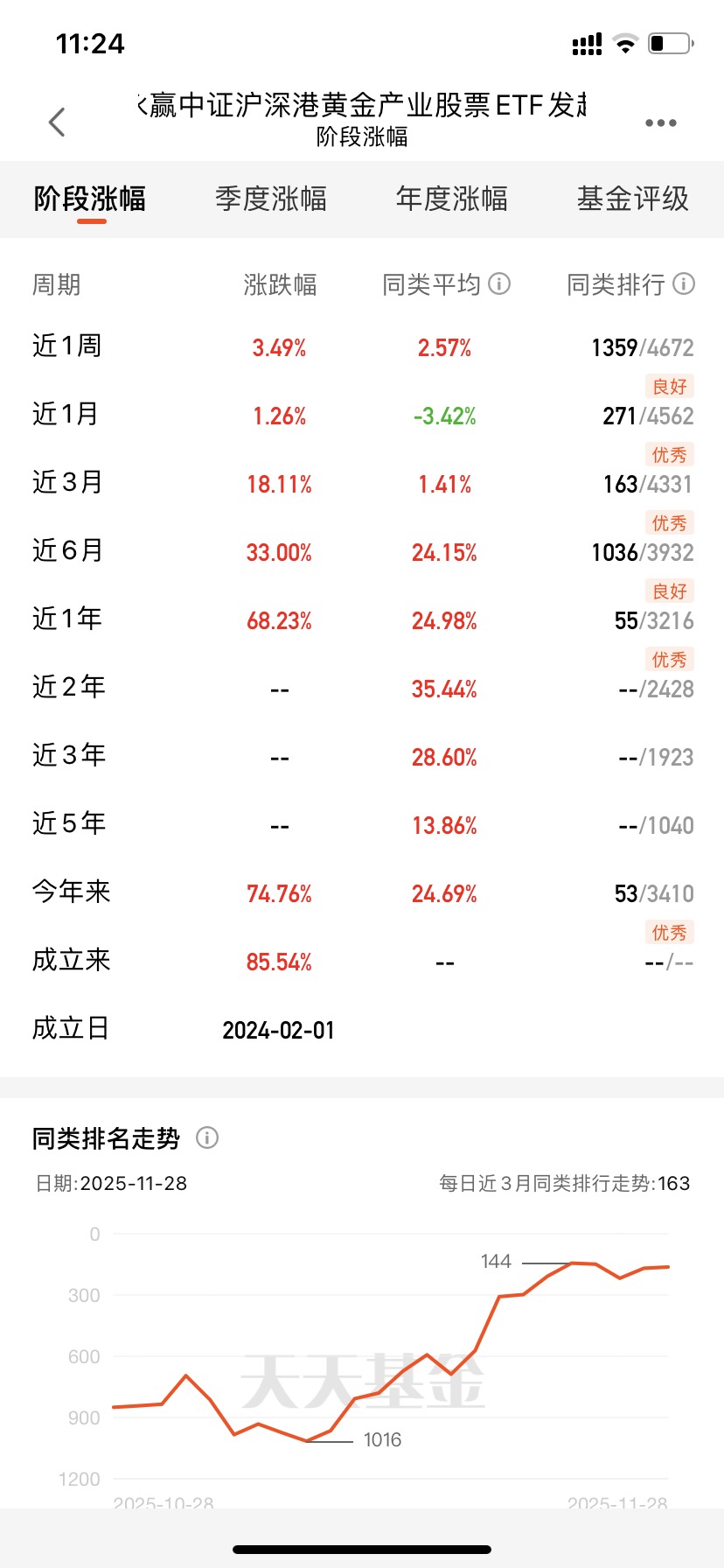 $永赢中证沪深港黄金产业股票ETF发起联接C$ 紧密跟踪黄金产业指数,是场外唯一的黄金股指数基,黄金股作为黄金的放大器,其弹性很强,上周五天四涨,状态还是稳健向上的,近半年涨超33%,近一年涨超68%,业绩表现还是很优秀稳健的!黄金板块的中长期走势不变,还是很值得继续专注了!#11月我的投资总结!#